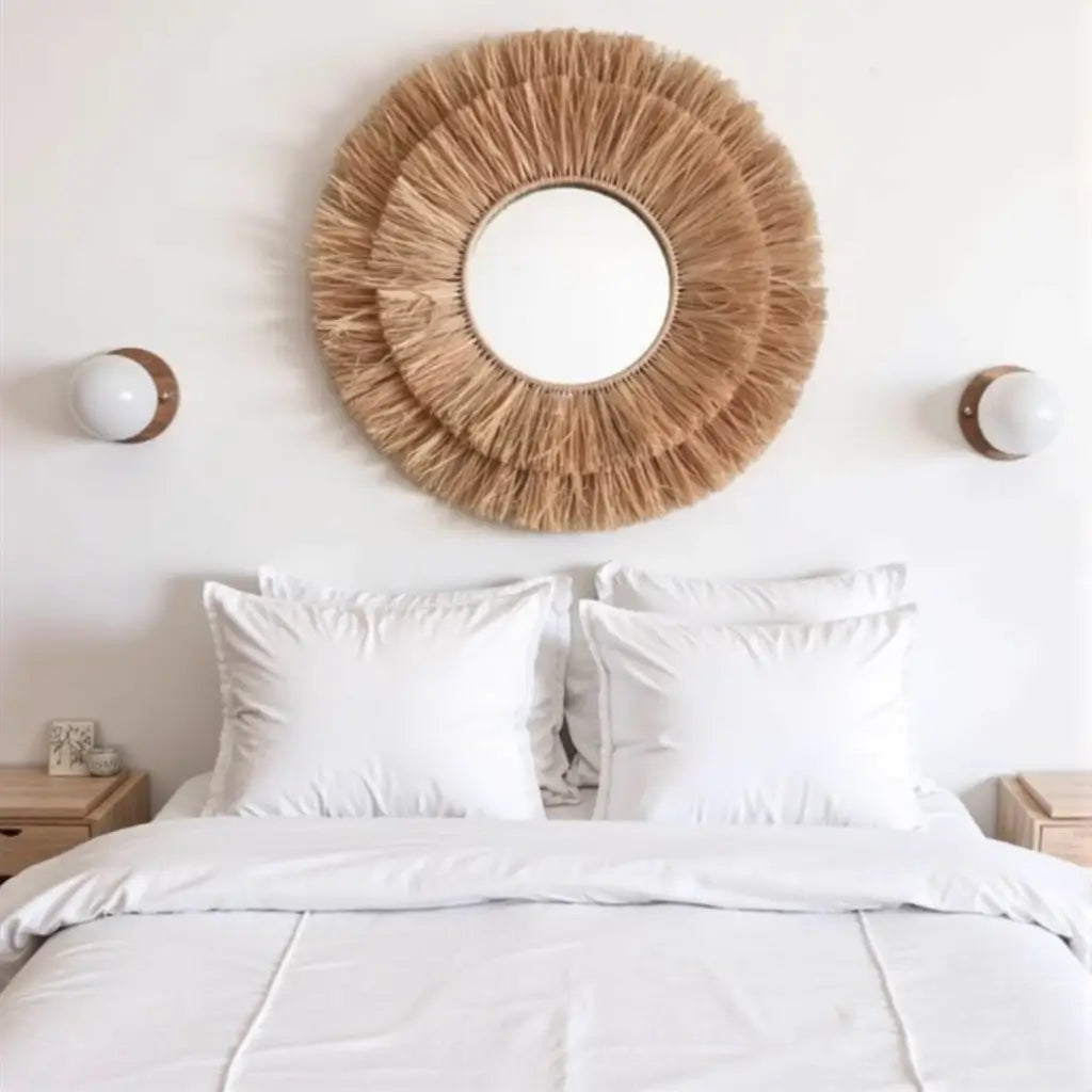 The Round farmhouse mirror straw is unique and timelessly elegant. Its frame is made up of organic straw, which is both durable and environmentally friendly.